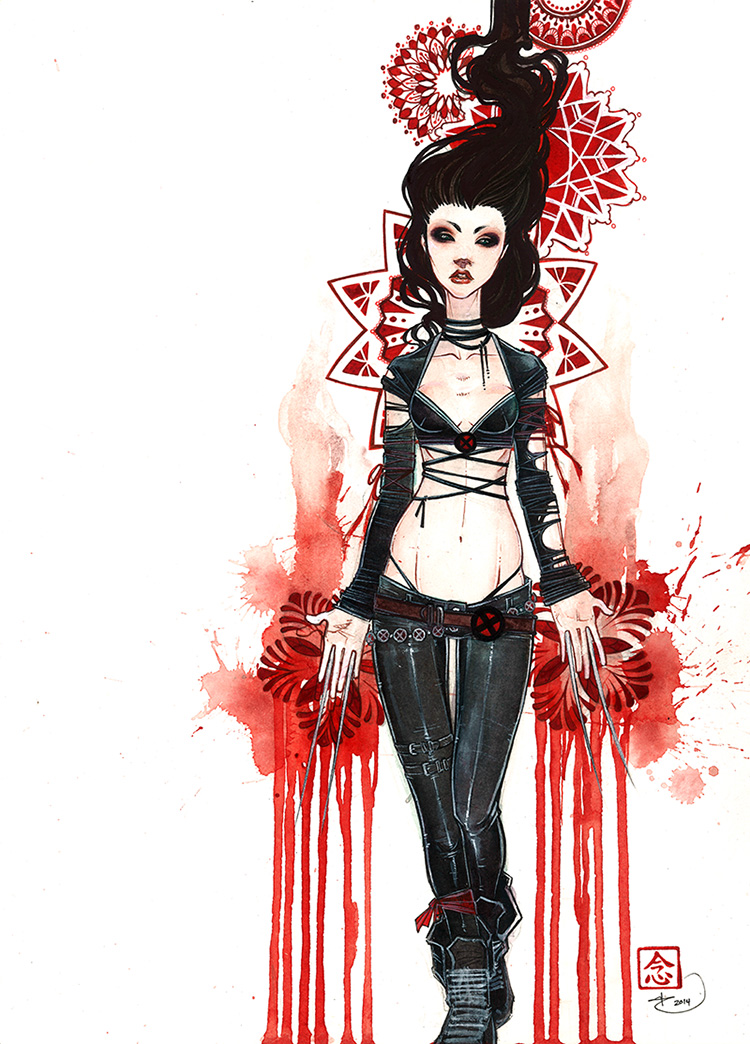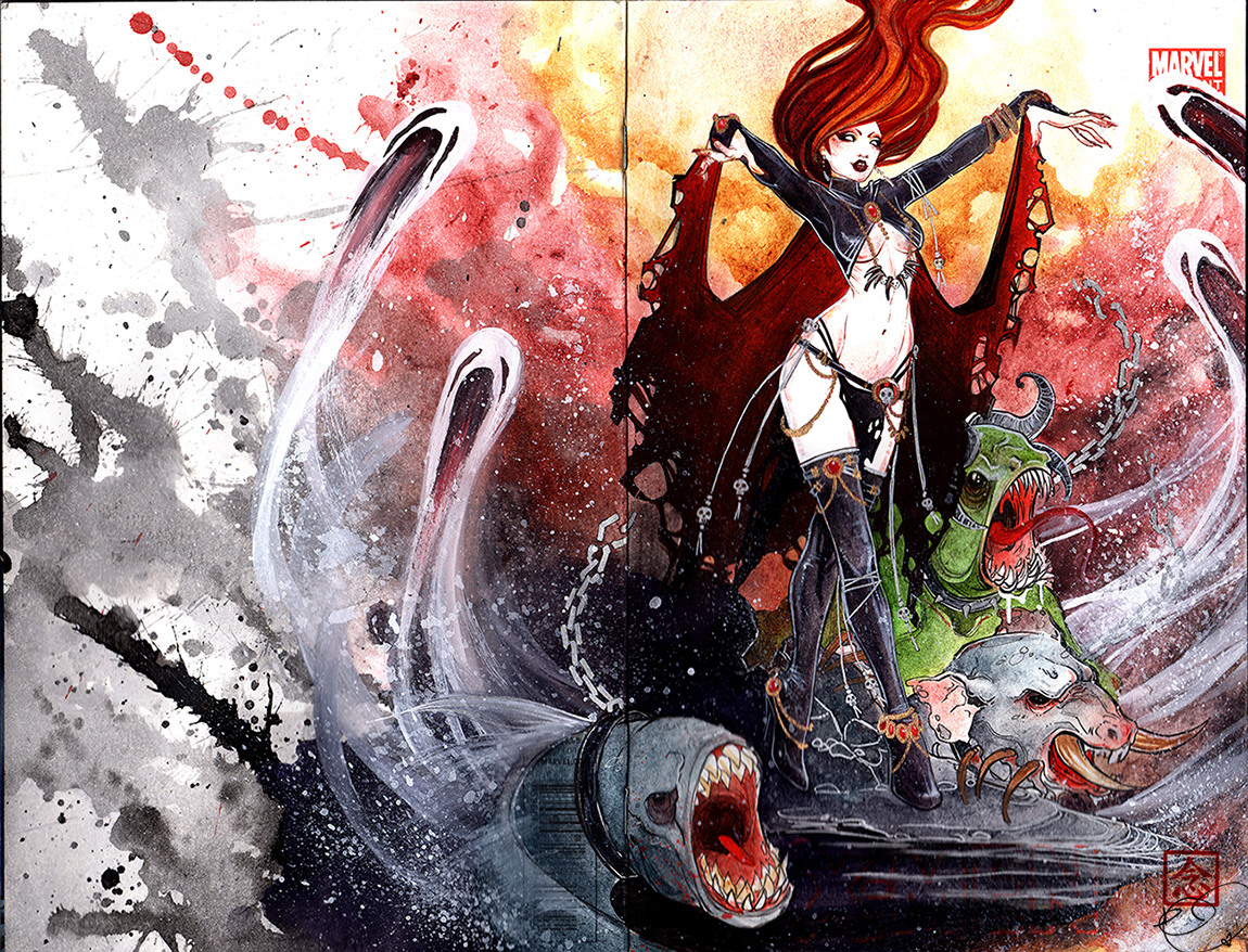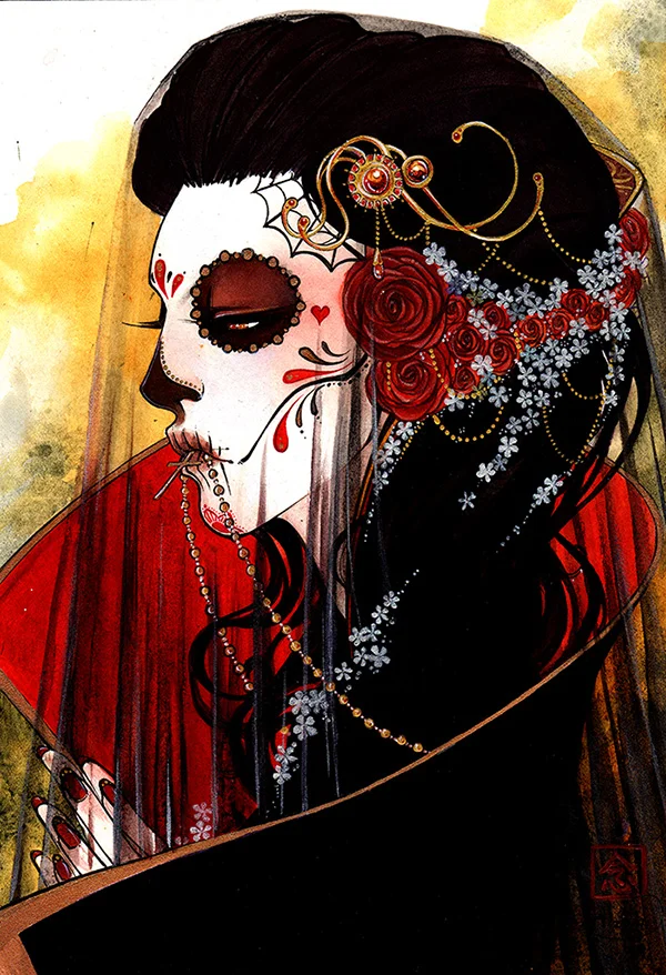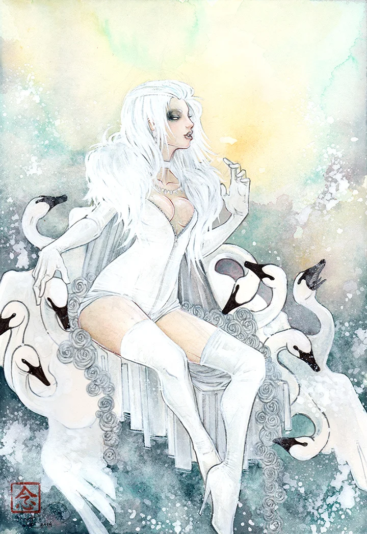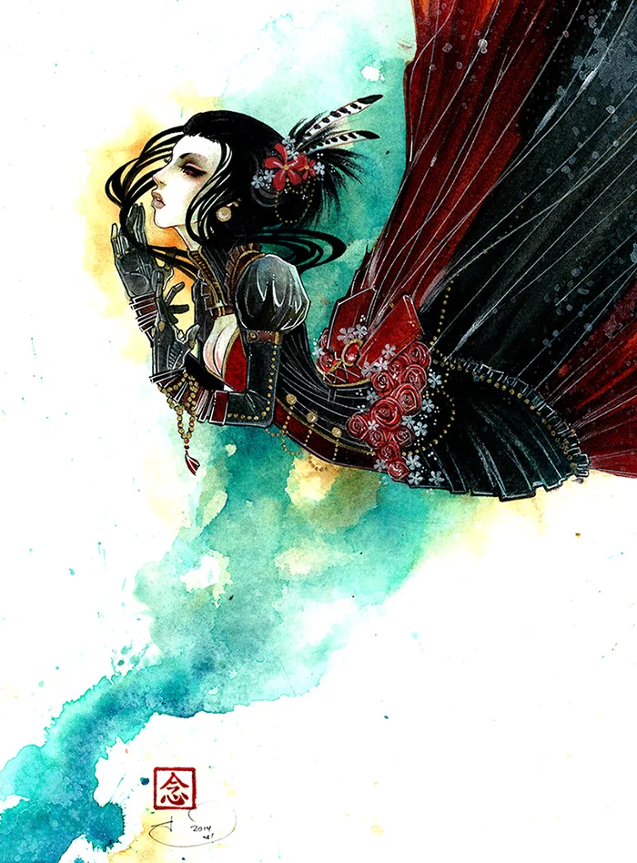 2014 was more of the same, although I was free from sketch covers and began my first large paintings in late 2014, going from a typical size of 10x14 to my biggest painting to date at 22x30 (The White Crow. That took the last 3 months of 2014 LOL). It was also the first painting that I didn't ink the outlines on, which I would start pursuing through 2015. 2014 was also when my first comic covers were commissioned-- the same large painting for Aspen Comics, immediately followed by a query from DC comics for Justice League America. I also began working my first cards for L5R in late 2014.