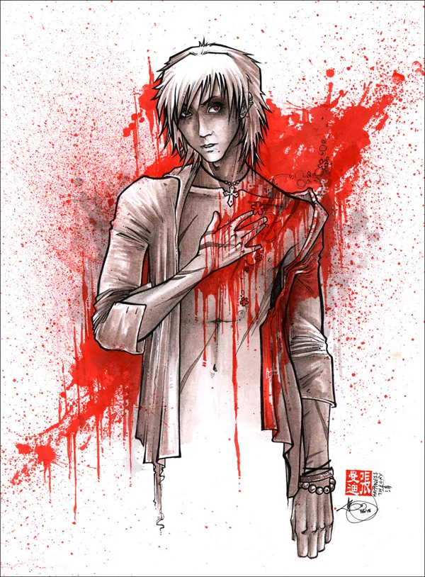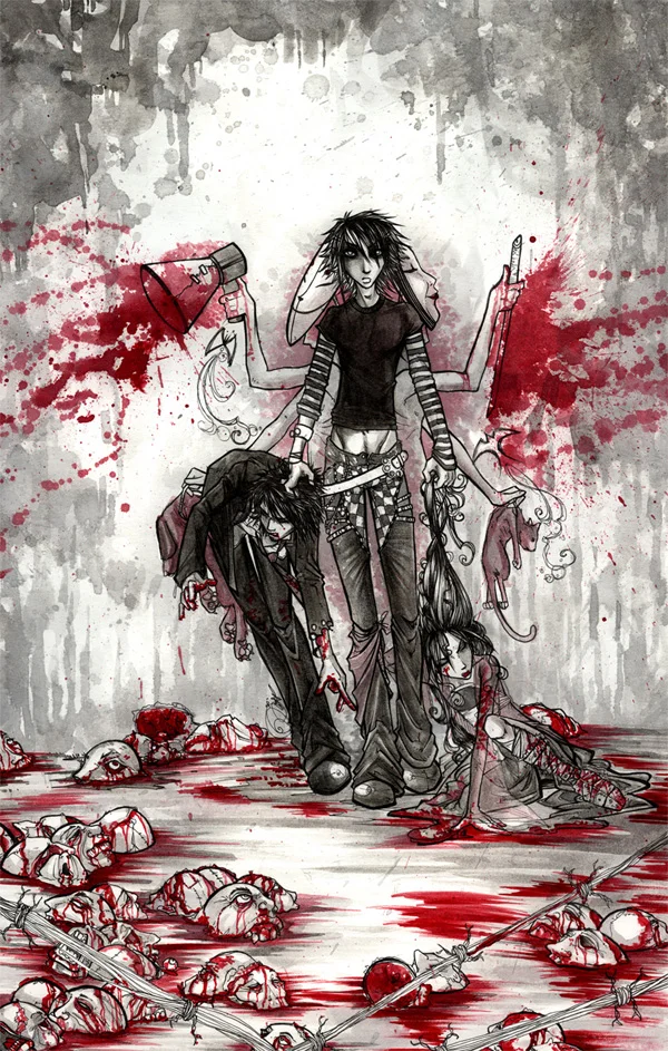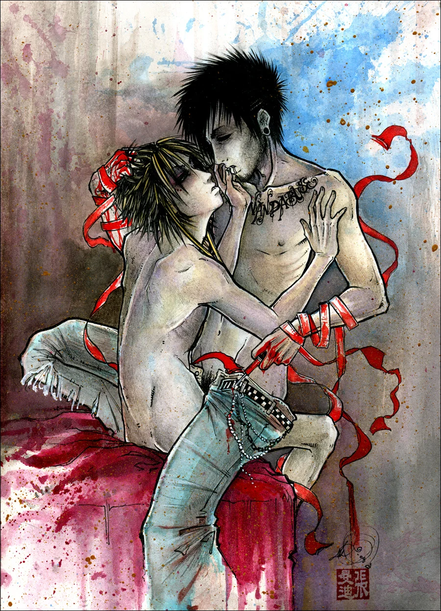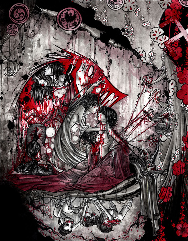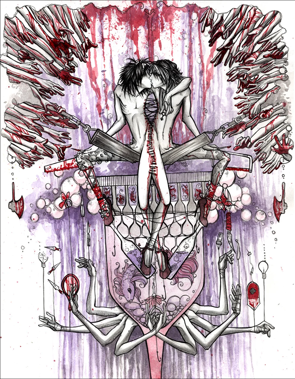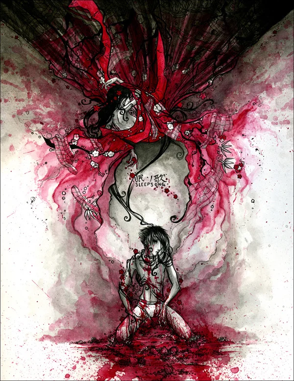 This is as early as we go because you don't need to see what I did in high school rofl Anyways, primarily from 2003-2008 I was self described as low brow, specifically subscribing to a specific Japanese style called Eroguro Nonsense, pulling erotic and grotesque imagery to create weirdly beautiful nightmare fuel. Filth was my first painting that went viral. During this period, I was developing my control of water based media by primarily utilizing ink washes with additive colour. I developed a visual language that mirrored the idea of emotional pain as physical pain and I saw a lot of success in my early career with these ideas, running my first 3 solo gallery showings on the back of this material. a lot of the pieces ended up being very stream of consciousness, where the initial idea was in the center and then tertiary ideas would kind of spiral out from the initial concept, almost like a sketchbook on the page. A lot of the time, there would be no overall idea of the image, just the initial idea and everything else was added later, especially as the pieces became more complicated. I was also super insane during this period of my life, particularly the 2005-2007 part where I was dealing with a major eating disorder that altered my perception and brain chemistry significantly, but it was important in my development as an artist and as a person. In 2008, i discovered colors other than red and ink that wasn't black.